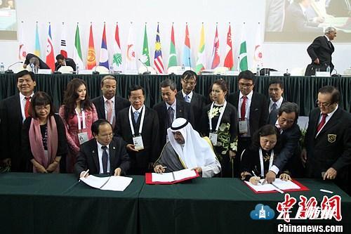 资料图:第31届亚奥理事会全体代表大会2012年11月8日在澳门举行。经大会投票,2019年第18届夏季亚洲运动会主办地落户越南河内。图为亚奥理事会与越南代表团签订举办协议。中新社发 龙土有 摄