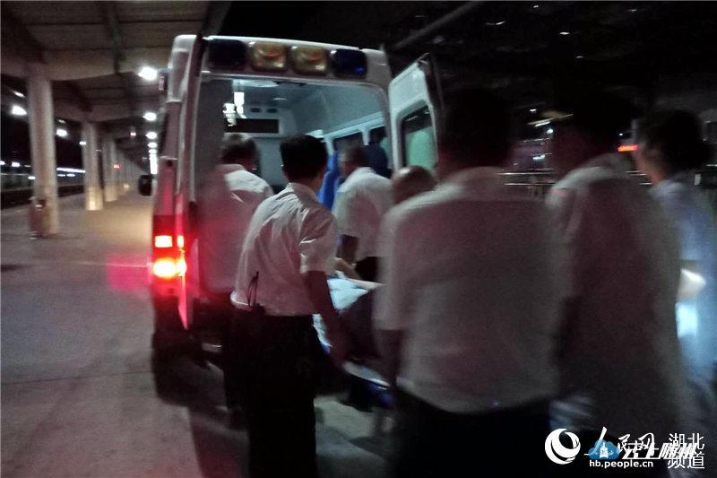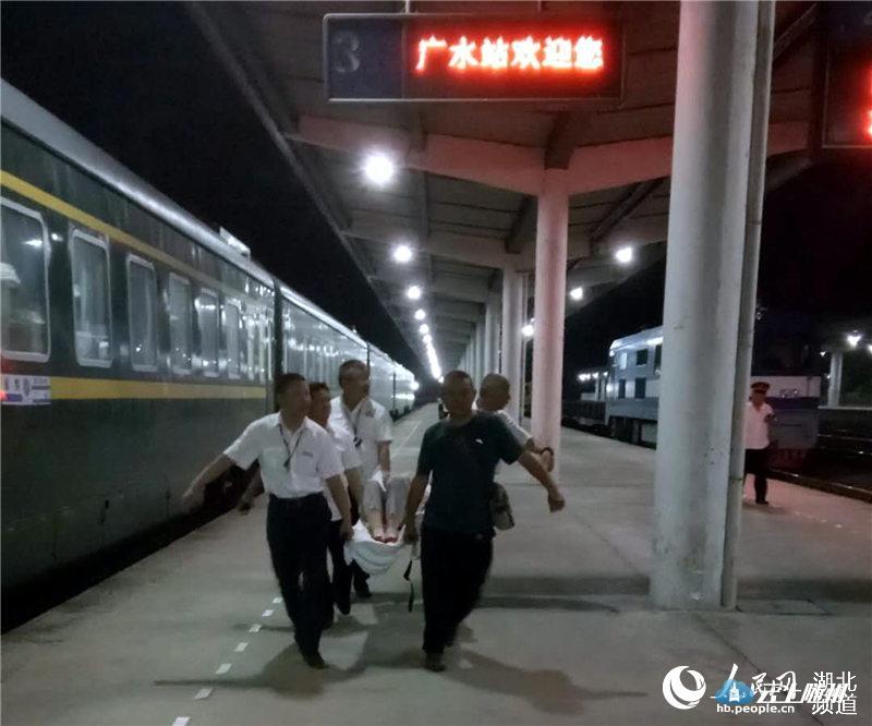20时56分,Z49次列车在广水站6道停稳,客运值班员熊和平与列车长办理交接后,站车人员小心翼翼地将孕妇扶上担架,张扬迅速组织副站长刘振宝等6人抬起担架,快速通过连接三站台和一站台的地道,将孕妇抬上刚刚驶入一站台停稳的120急救车上,与孕妇同行的两位大人、两位儿童及携带的行李也被及时送上急救车。 21时10分,救护车一路呼啸,将孕妇送往广水市第二人民医院。 21:16分,Z49次列车从上行6道开车,经南头道岔区,驶入下行正线,赶往下一站武昌。