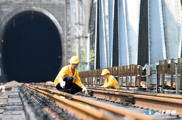 8月14日,“护桥卫士”在高温天气下进行枕木涂油腻缝作业。