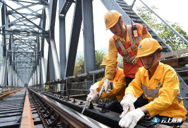 8月14日,“护桥卫士”在工长周子义(中)的指导下对钢梁大桥温调器进行检查和养护作业。