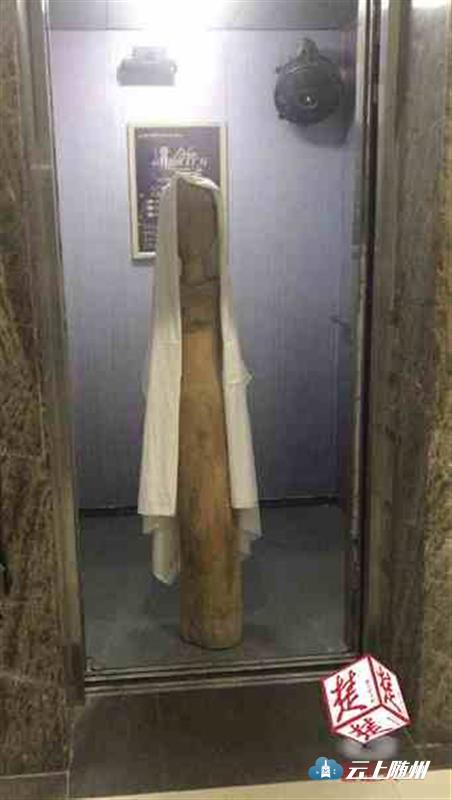 凌晨时分,本应空无一物的电梯内,竟摆放着一个一人高的,仅刻有一张人脸的圆柱形木雕,且木雕头部还盖着一块白色的长条幕布,看上去十分吓人。今日,市民陈女士(化名)说起此事时仍惊魂未定,电梯门刚刚打开的那一幕,一直在她脑海里挥之不去。