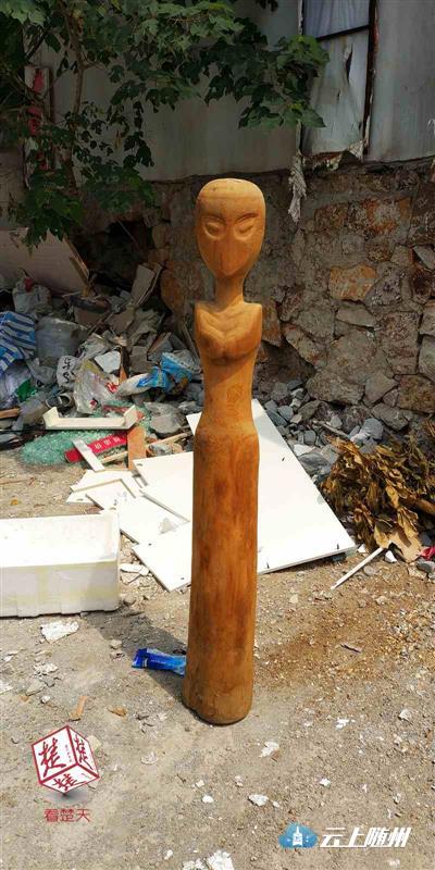 今日上午11时许,楚天都市报记者来到该小区,在小区一处垃圾堆放点,发现了陈女士所说的人型木雕。记者看到,一人高的黄色原木上,确实刻了一张人脸,但这张脸上只能看出大概的脸型轮廓,且脸上只刻有眼睛,却没有嘴巴。