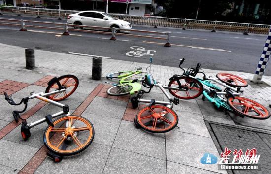 台风刮倒一地的共享单车随处可见。中新社记者 刘可耕 摄