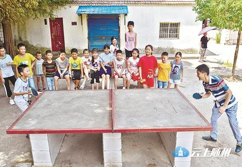 图为:洪湖市滨湖办事处洪狮小学内,老师周永杰义务帮学生补习数学之余,教孩子们打乒乓球 楚天都市报记者刘中灿摄