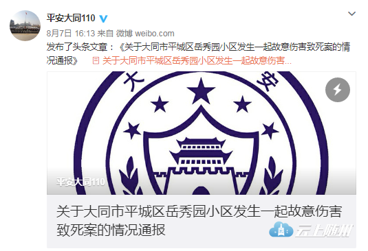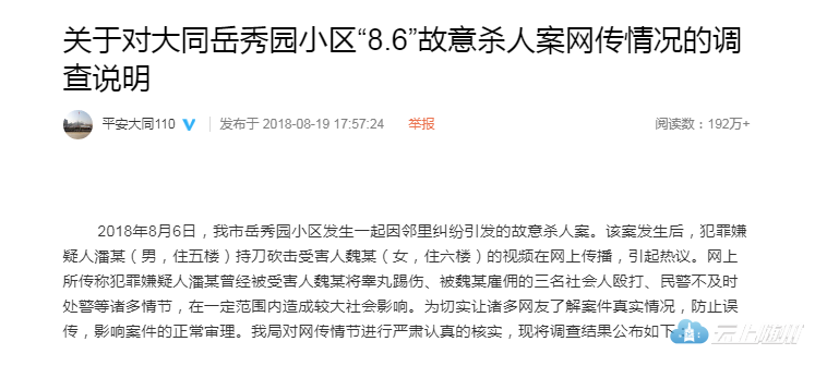 事件发生后,19日大同警方通过微博“平安大同110”发布情况说明,犯罪嫌疑人潘某(男,住五楼)持刀砍击受害人魏某(女,住六楼)的视频在网上流传,引起热议。有传言称“犯罪嫌疑人潘某曾经被受害人魏某将睾丸踢伤、被魏某雇佣的三名社会人殴打、民警不及时处警”等情节与事实不符。