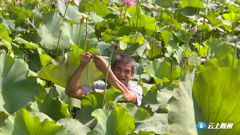 (图为左榨村贫困户毛世新正在采摘莲蓬)