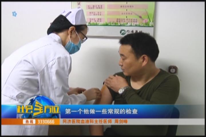 <采访人>同济医院血液科主任医师 周剑峰:第一个,他做一些常规的检查,另外一方面就是 打一个造血干细胞的动员针,就是这个针打了以后,让造血干细胞 从骨髓能够附集到外周血,这样方便我们采集。
