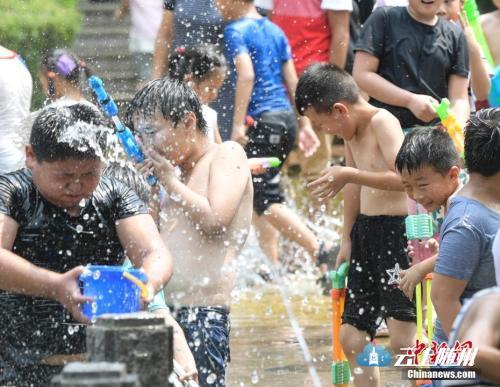 8月7日,济南发布高温橙色预警,市区气温超过35℃,民众纷纷到泉水边消暑纳凉。 中新社记者 张勇 摄