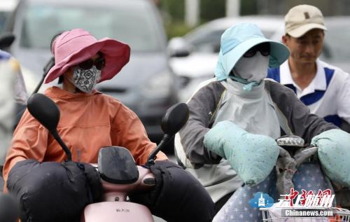 7月16日,南京市民“全副武装”骑车出行。当日,南京继续高温晴热天气。中新社记者 泱波 摄