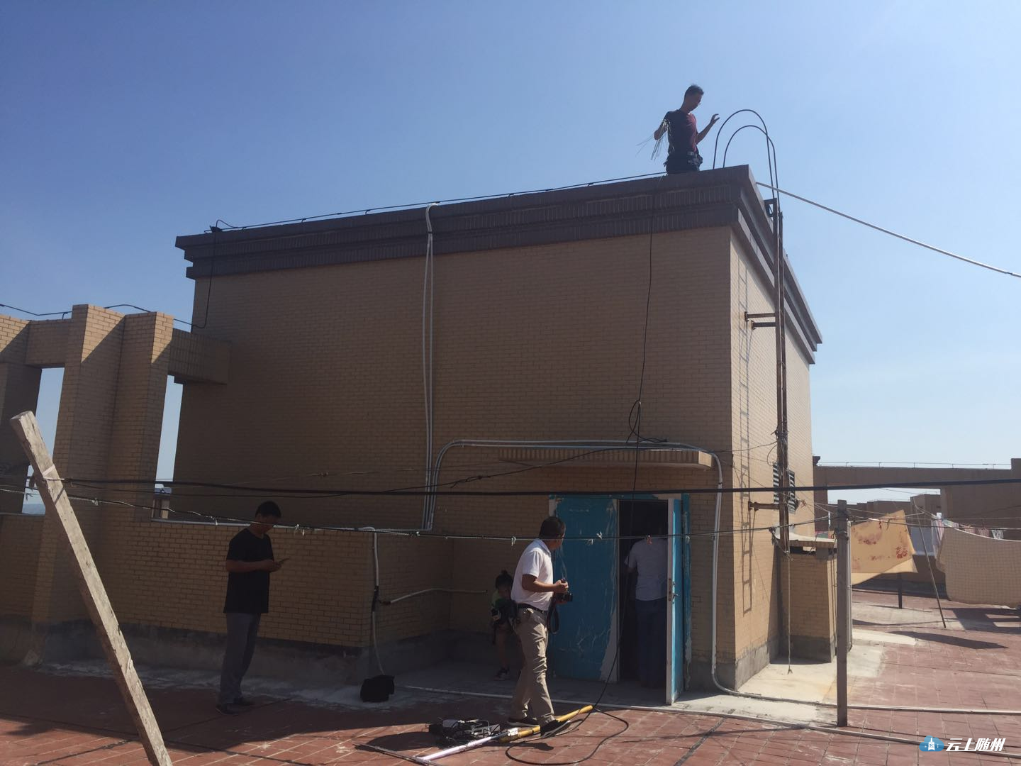 工作人员在房间内查获黑广播发射机一套,现场发现黑广播发射设备、天线、交流稳压电源、短信远程控制器等违法器材。随后,工作人员又在另一栋楼顶的电梯井里发现了私人搭建的电缆、发射器、远程开关等一批违法设备,现场十分隐蔽。