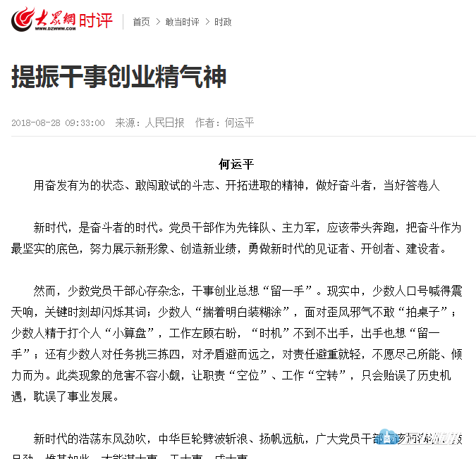 “党的干部是党的事业的骨干”。党员干部良好的精神状态,是做好一切工作的重要前提。新时代,激发新状态、提振精气神,就要把广大党员干部广泛而有效地调动起来,用奋发有为的状态、敢闯敢试的斗志、开拓进取的精神,做好奋斗者,当好答卷人。(作者为湖北随州市曾都区委书记)