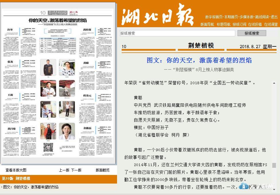 近日,经省委宣传部组织评审,“荆楚楷模”8月上榜人物名单揭晓,中国好孙子、武汉铁路局襄阳供电段随州供电车间助理工程师、西城办事处玉波门社区90后青年黄聪榜上有名。