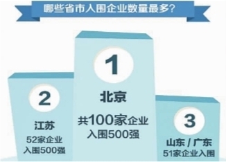 从上榜企业数量看,北京以100家企业高居榜首,江苏以52家企业位居第二,山东、广东并列第三位。
