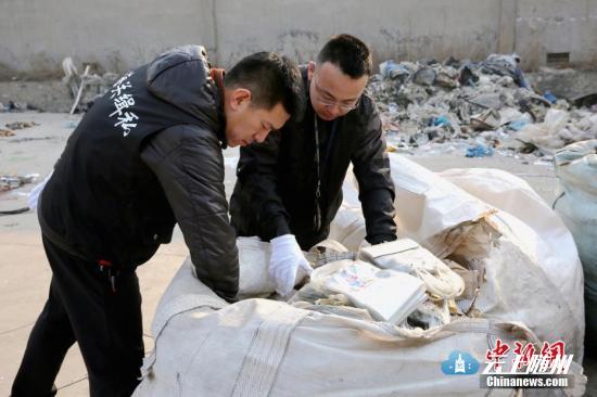 资料图:大连海关缉私警员查看洋垃圾。 中新社发 宋成明 摄