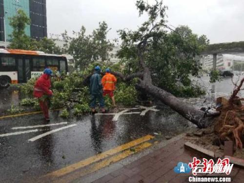 台风过后,广州绿化抢修人员正在清理倒下的树木。王玮 摄