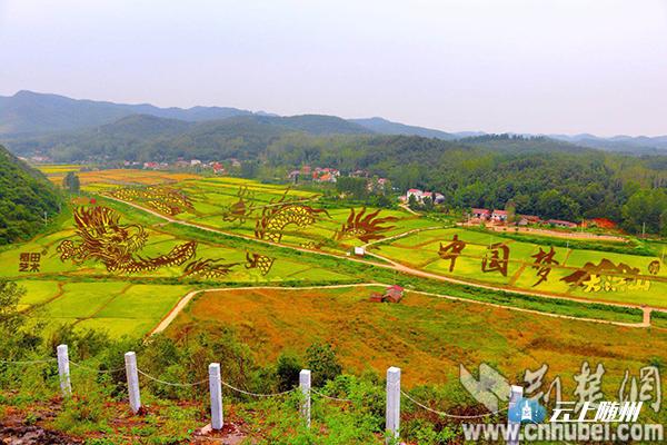 9月17日,湖北随州大洪山现巨幅“中国梦”稻田艺术画作。该艺术画以五种颜色天然彩色水稻为“颜料”,在超160亩的稻田里,种植出一幅由腾飞的“中国龙”和“中国梦”三个大字构成的立体艺术图案。