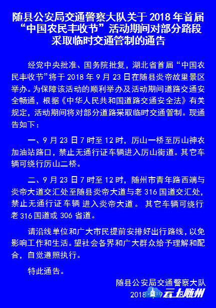 2018年首届“中国农民丰收节”活动期间对部分路段采取临时交通管制通告