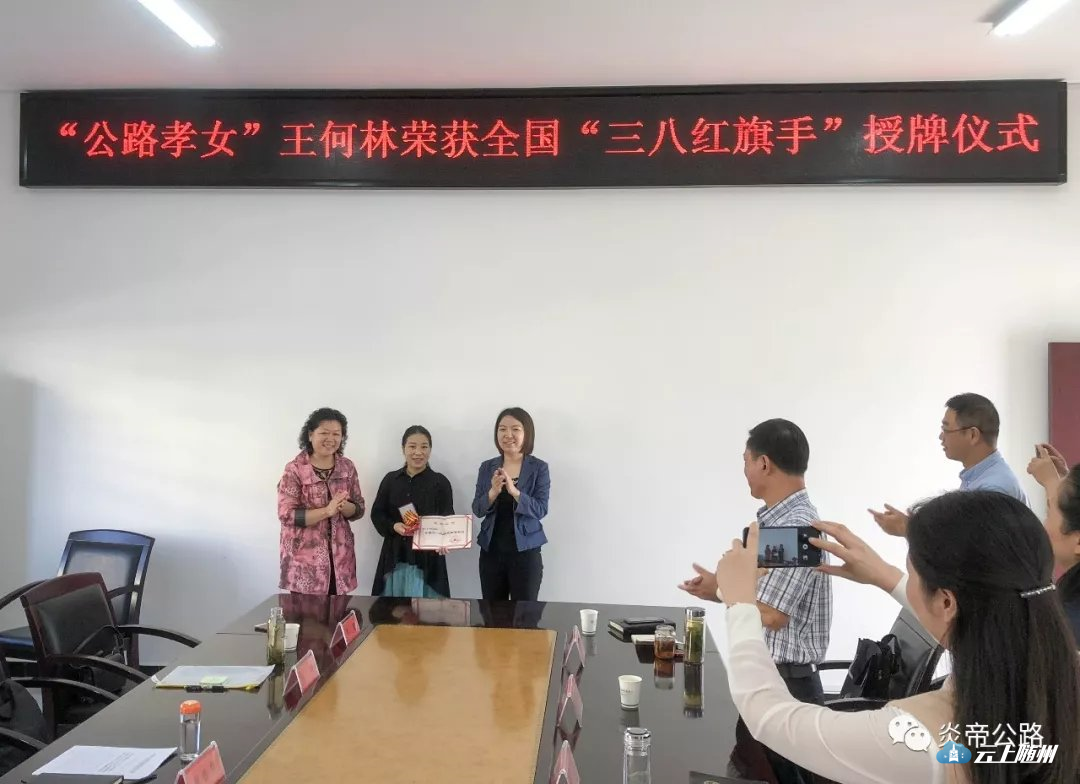 9月29日国庆节来临之际,随县殷店公路管理站热闹非凡,随州市妇联主席张春霞、随州市交通运输局副局长沈新燕、随县副县长陈巧一行亲自莅临公路管理站,向随县“公路孝女”王何林送来了全国“三八红旗手”荣誉证书和奖章。这是继王何林荣获中国好人、荆楚楷模、省五一劳动奖章、省三八红旗手标兵、省第五届道德模范提名奖等多项荣誉之后获得的最高级别奖章。也是随县建县来首位获得全国“三八红旗手”荣誉称号的巾帼女性代表。