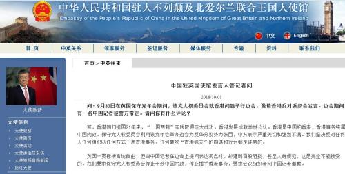 中新网10月1日电 据中国驻英国大使馆网站消息,驻英国使馆发言人1日就一名中国记者在英国保守党年会期间被警方带走一事,回答记者提问。发言人指出,我们要求保守党人权委员会停止干涉中国内政,停止插手香港事务,要求会议组织者向中国记者道歉。