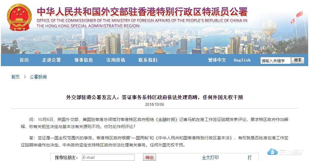 人民网北京10月7日电 据外交部驻香港特别行政区特派员公署网站消息,在外交部驻香港特别行政区特派员公署例行记者会上,记者问:10月6日,英国外交部、美国驻香港总领馆对香港特区政府拒绝《金融时报》记者马凯在港工作签证延期发表评论,要求特区政府作出解释,称有关拒签决定与基本法有关原则不符。你对此作何评论?