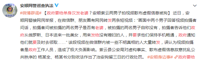 近日,贵州安顺市公安局网络安全保卫支队官微就网传“政府要给单身汉发老婆”一事发布通报,涉事两男子因拍摄视频散布虚假信息,扰乱公共秩序,被处以拘留三日的行政处罚。