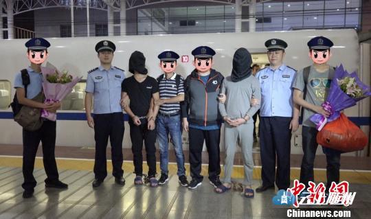 两名头戴面罩的嫌疑男子被几名便衣民警押解出站。警方供图