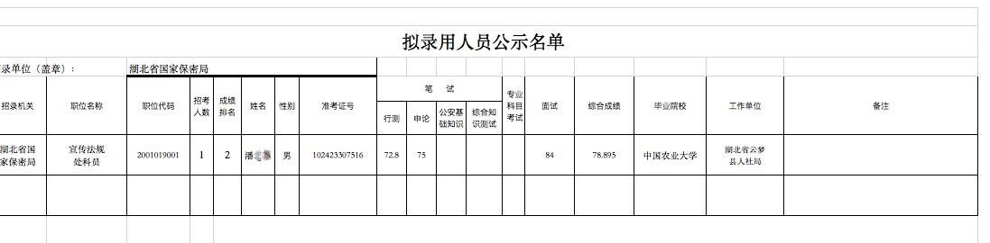 同年12月9日,湖北省人事考试网发布了《湖北省国家保密局2016年考试录用公务员拟录用人员公示》,将湖北省保密局拟录用人员潘某予以公示,并留下了举报电话。
