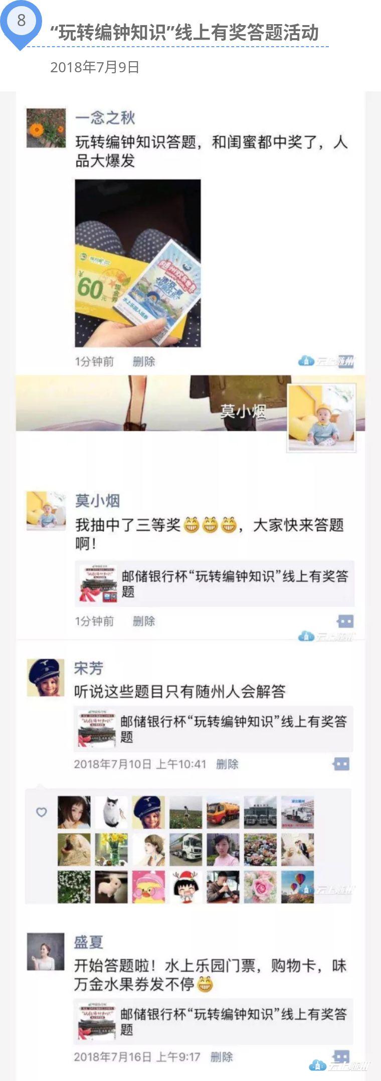 为纪念曾侯乙编钟出土40周年,充分发掘曾侯乙编钟所承载的中华礼乐文明内涵,弘扬优秀传统文化,云上随州客户端联合中国邮政储蓄银行随州市分行、随州博物馆联合推出2018邮储银行杯“玩转编钟知识”线上有奖答题活动,数万网友参与网上答题。