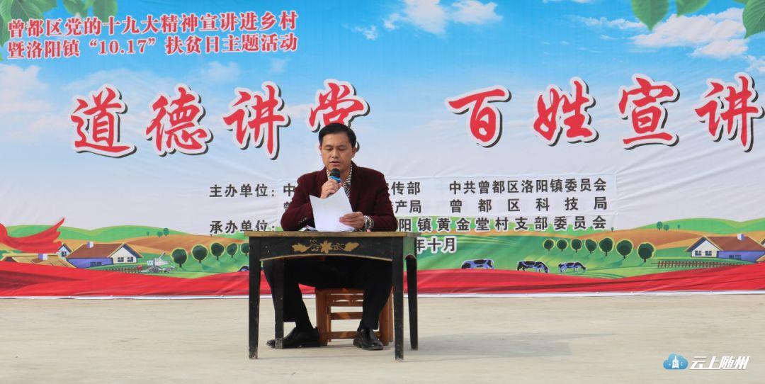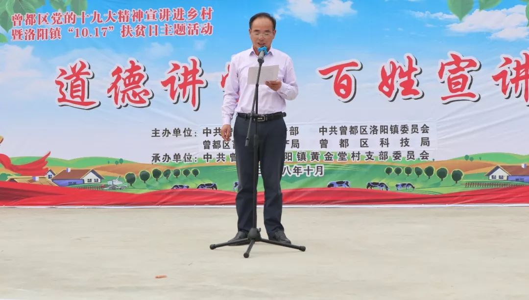 “小康不小康,关键看老乡!”10月16日,由区委宣传部、洛阳镇委、区畜牧兽医特产局、区科技局主办,洛阳镇黄金堂村支部委员会承办的党的十九大精神宣讲进乡村暨洛阳镇“10.17”扶贫日主题活动在黄金堂村文体广场举行。