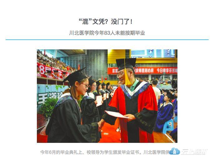 据华西都市报报道,由于学业成绩没有过关,川北医学院今年有83名学生未能正常毕业,这在学院67年办学史上是第一次出现。