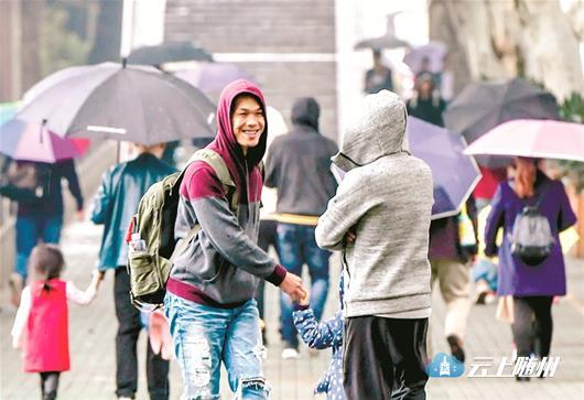 图为武汉昨日冷雨,年轻人已穿上厚衣