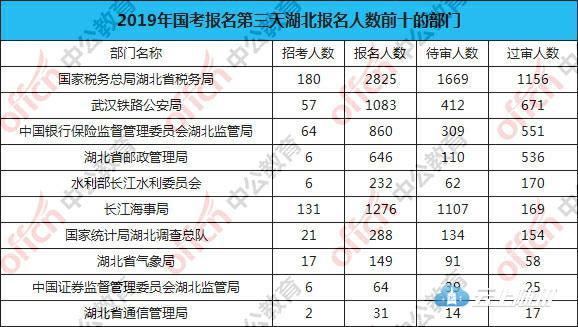 截止到24日16时,通过审核人数前三位的部门依次是:国家税务总局湖北省税务局、武汉铁路公安局、中国银行保险监督管理委员会湖北监管局,三部门通过审核总人数2378人,占通过审核总人数的67%。