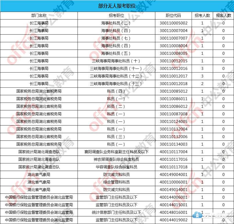 工作地点在湖北的职位共有27个无人报考,占全部职位的7%。下面是无人报考职位一览表(图三),建议广大考生多关注一些较冷职位,避免激烈竞争,结合自身条件,找到属于自己的最佳职位。