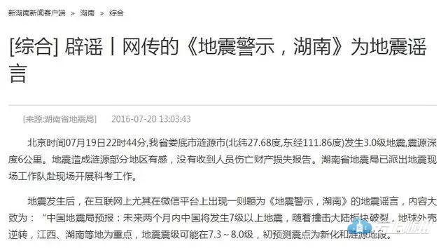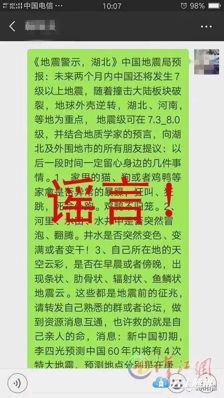 内容大致为:“中国地震局预报:未来两个月内中国将发生7级以上地震,随着撞击大陆板块破裂,地球外壳逆转,湖北、河南等地为重点,地震级可在7.3-8.0级。不管是真是假作为湖北人都宣传一下。”