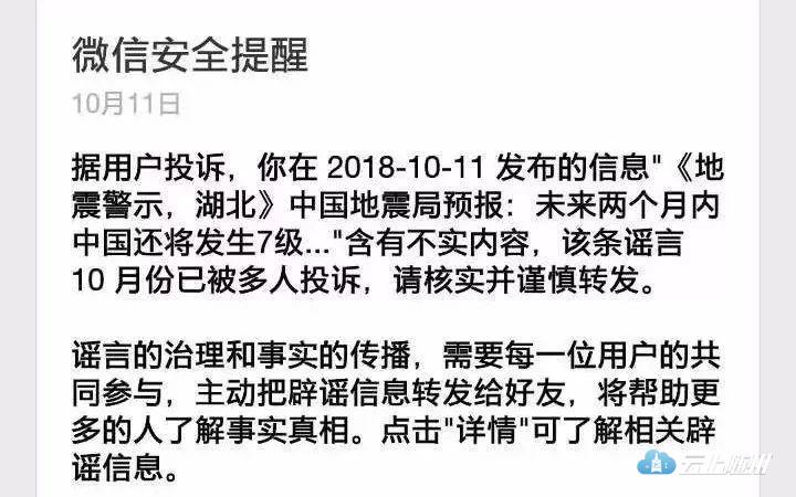 湖北省地震局官网已有辟谣报道:《地震警示,湖北》是谣言,传播谣言将被追究法律责任。地震局微信官方平台也就此则谣言进行了提醒。