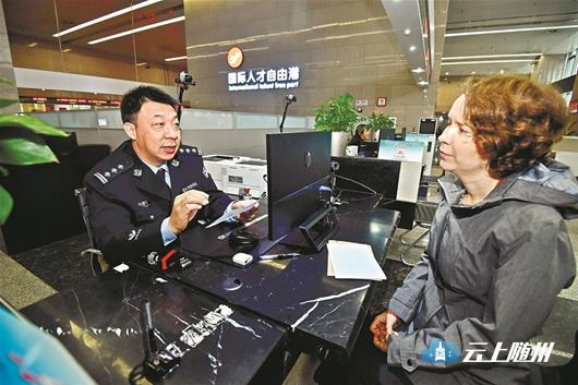 图为:近日,郭兵在公安出入境窗口接待英国女士