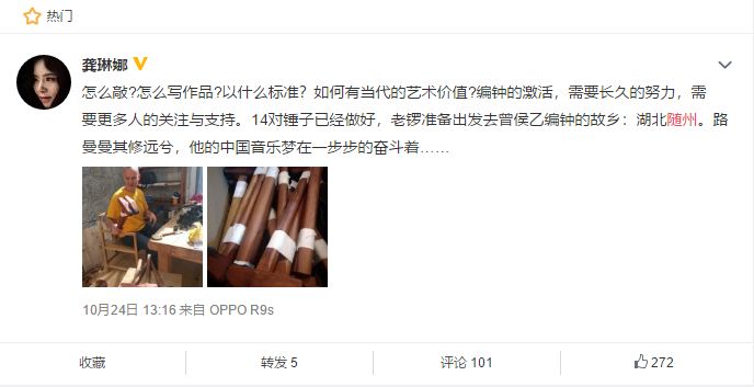 龚琳娜通过微博分享了一段视频。视频中,老锣正在专心致志的制作敲击曾侯乙编钟的锤子,每一个锤子的大小、重量、硬度、密度,尤其是锤头的橡皮必须特别结实。无论从声音还是敲击技巧都要彻头彻底的实践,最终找出符合的方法。