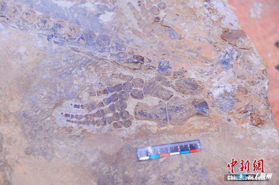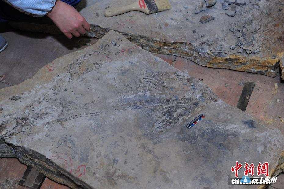 图为新发现的身长1.8米的湖北鳄类化石。中新社记者刘康摄