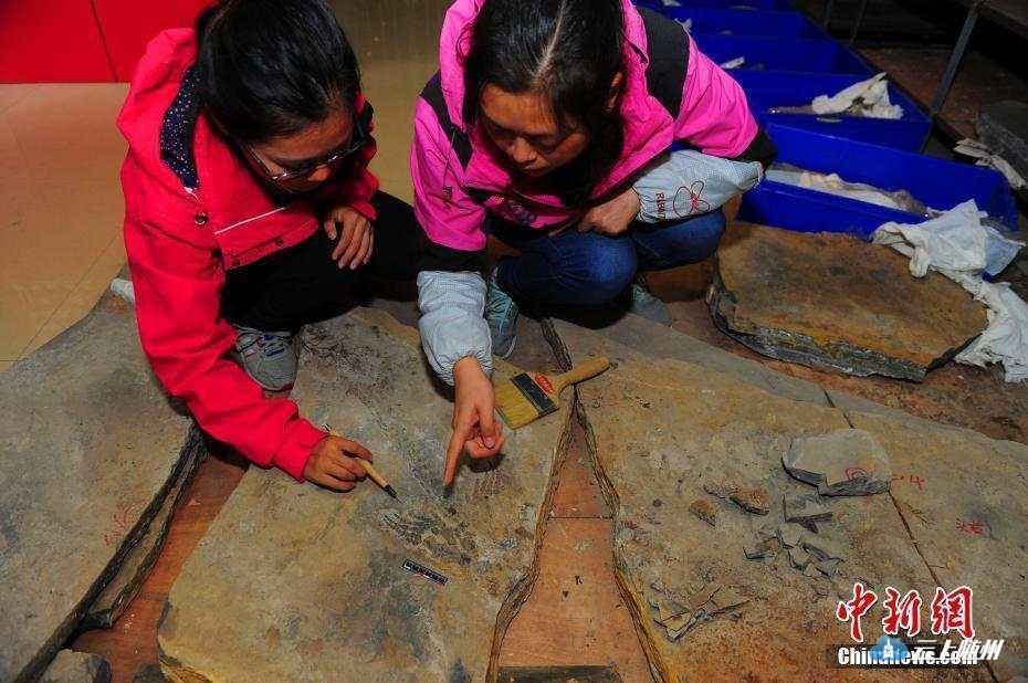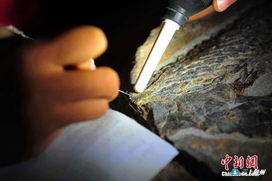 10月24日,湖北省地质科学研究院科研人员发布消息称,通过系统的发掘研究,在湖北远安化石群国家地质公园查明了5.2米的含化石层位,发现了大量的湖北鳄类化石和一具较完整的鱼龙类化石。图为研究人员对发现的鱼龙类化石进行修复。中新社记者刘康摄