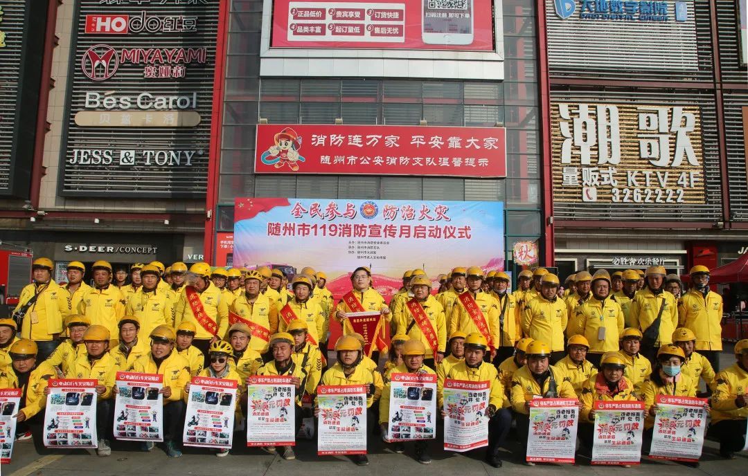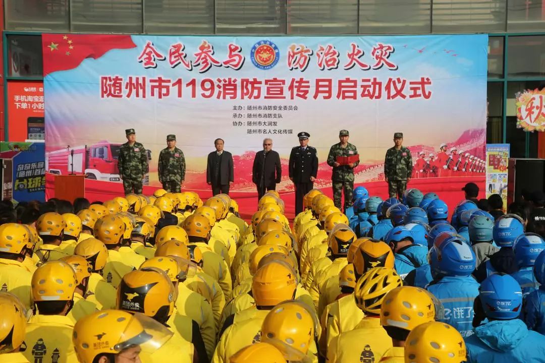 11月8日上午,随州市举行2018年“119”消防宣传月活动启动仪式。市政府副秘书长王贤江,市安监局局长刘耘禾,市公安局党委委员、副局长刘建明,市消防支队支队长冯明静、政委任国庆等领导出席启动仪式,全市消防安全重点单位负责人、随州“美团外卖”全体员工、随州“饿了么”全体员工、蓝天救援队队员、随州消防支队指战员代表共计300余人参加活动。仪式由刘建明同志主持。