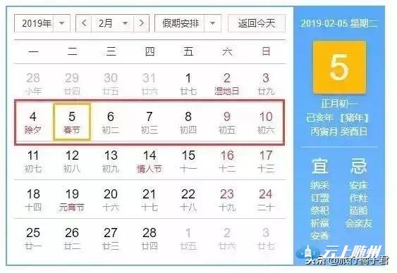 2019年春节是2月5日(星期二),