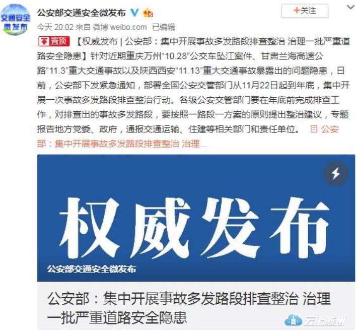 据公安部交通管理局官方微博消息,针对近期重庆万州“10.28”公交车坠江案件、甘肃兰海高速公路“11.3”重大交通事故以及陕西西安“11.13”重大交通事故暴露出的问题隐患,日前,公安部下发紧急通知,部署全国公安交管部门从11月22日起到年底,集中开展一次事故多发路段排查整治行动。