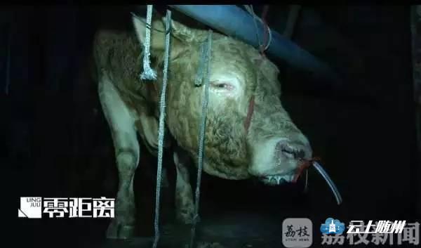 一根长约一米的塑料水管,从牛鼻直入牛胃,数次注水后,黄牛才被屠宰。12小时被注水120斤,黄牛疼痛难忍,干脆跪倒在地。