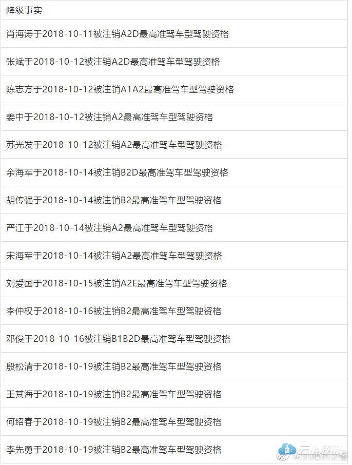 2018年10月份驾驶证降级人员:58名