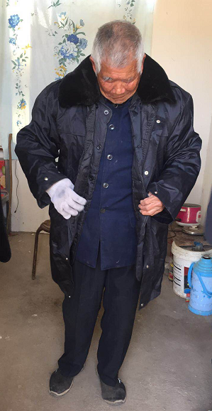 刘老汉试穿村里送来的棉衣