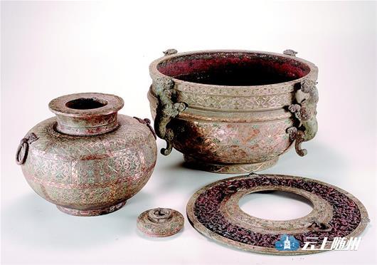一件作为酒器的铜鉴缶纹饰精美,金属丝形成钩连纹,点缀有孔雀石。为弄清镶嵌过程是否使用粘接材料,项目组请教北科大有机高分子材料专家,经研究发现粘接材料中有大漆和棕榈油成分,并通过取样到美国相关系统比对,确定粘接剂主成分具体为中国大漆。“这项研究让我们对古人科技水平和材料运用有了更深刻的认识。”