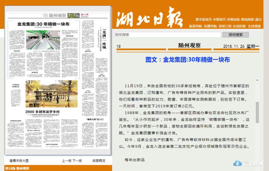 1988年,金龙集团的前身——曾都区西城办事处双龙寺社区防水布厂诞生。“从小作坊起步,30年来,金龙始终坚持‘做精做强一块布’,这几年每年至少研发一个新品,废物全部回收循环利用,走创新绿色发展之路。”金龙集团董事长饶金才说。