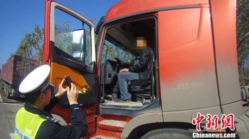资料图:交警对违规货车司机进行证据固定 韩飞 摄