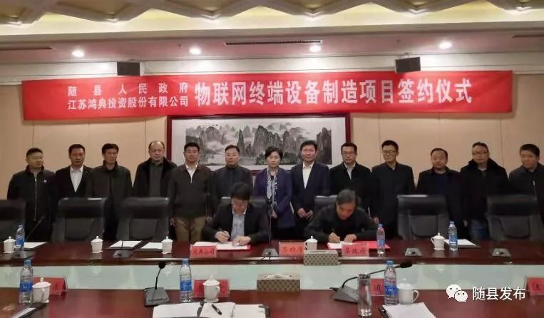 12月5日,江苏鸿典投资股份有限公司与随县人民政府成功签约,计划在随县经济开发区投资3亿元,建设物联网终端设备制造项目。
