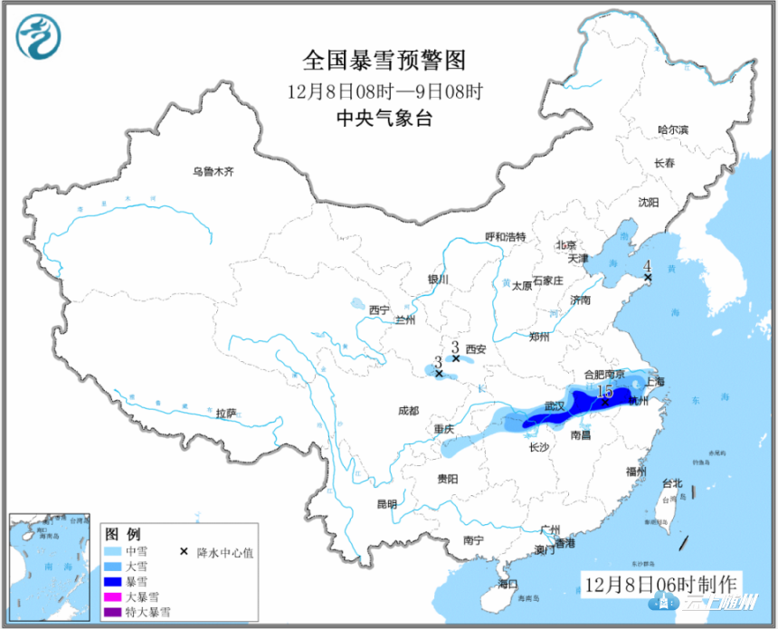 中央气象台12月8日06时继续发布暴雪蓝色预警 :